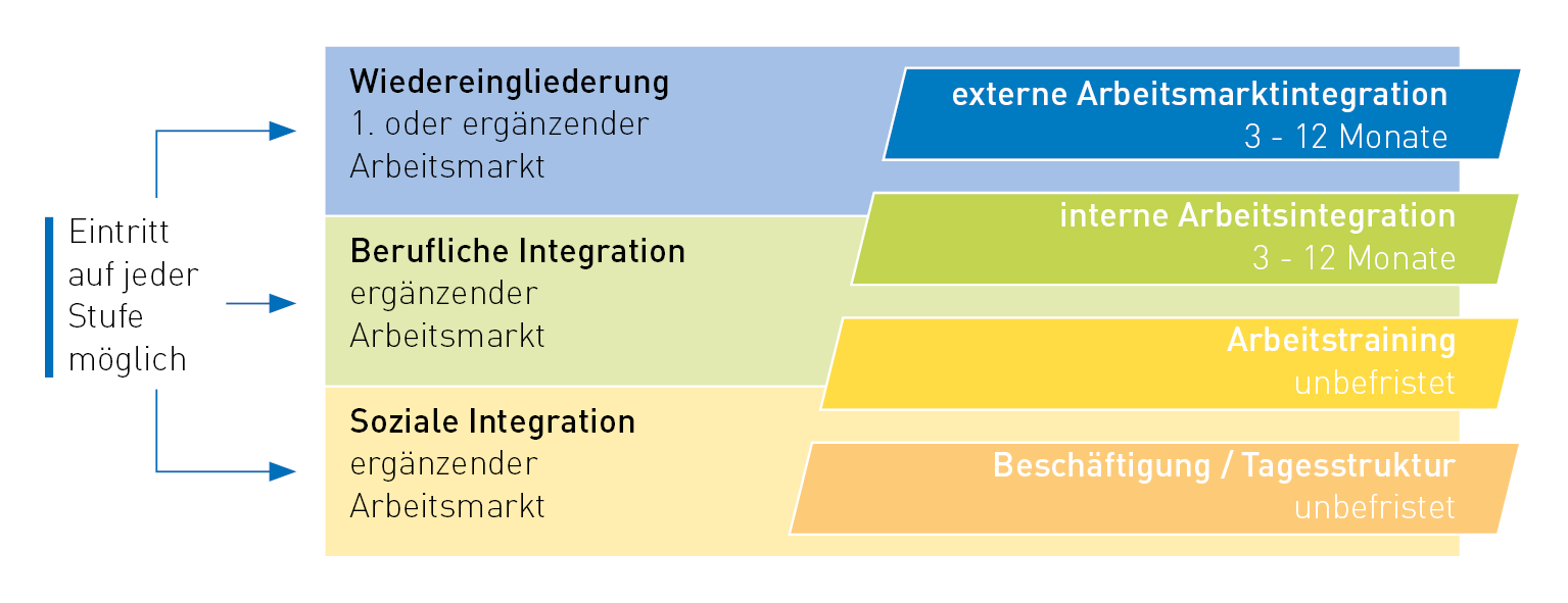 Unsere Angebote der suchtspezifischen Arbeitsintegration beinhalten verschiedene, bedarfsgerechte, aufeinander aufbauende Stufen, welche die individuellen Kompetenzen der Klientinnen und Klienten berücksichtigen. Der Einstieg ist in jeder Stufe möglich, unter Berücksichtigung des individuellen Leistungspotentials. Das Stufenmodell steht in allen aufgeführten Betrieben zur Verfügung.