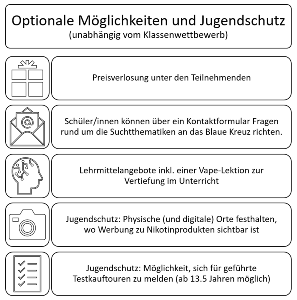 Daneben können sie aktiv beim Jugendschutz mithelfen. Diese sind nicht Bestandteil des eigentlichen Klassenwettbewerbs: