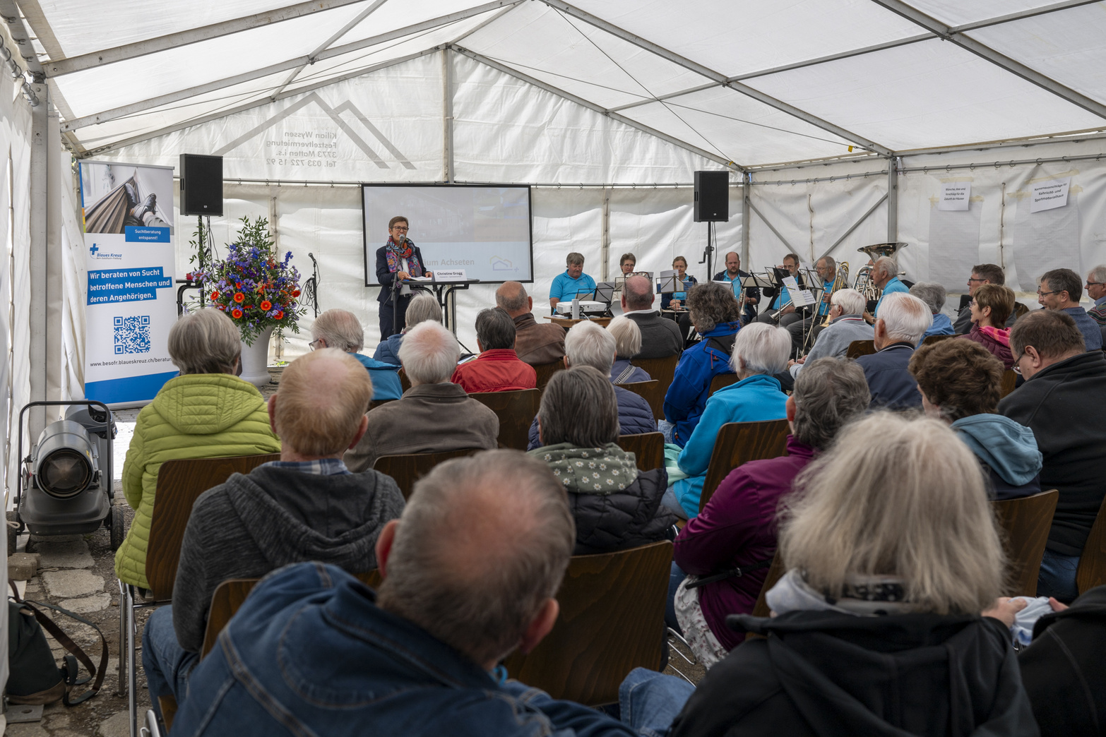 Der Tag begann mit einem liebevoll gestalteten Willkommensbuffet. Neben Kaffee, Tee und erfrischenden Getränken konnten sich die Gäste an hausgemachter Züpfe und feinem Hobelkäse stärken. Aufgrund der erfreulich hohen Teilnehmerzahl wurde der offizielle Festakt in einem festlich geschmückten Zelt abgehalten. Die Feierlichkeiten wurden durch den Posaunenchor Frutigen musikalisch begleitet. Anschliessend wurde ein schmackhaftes Mittagessen serviert – eine Gelegenheit für viele, alte Geschichten auszutauschen und gemeinsame Erinnerungen aufleben zu lassen.