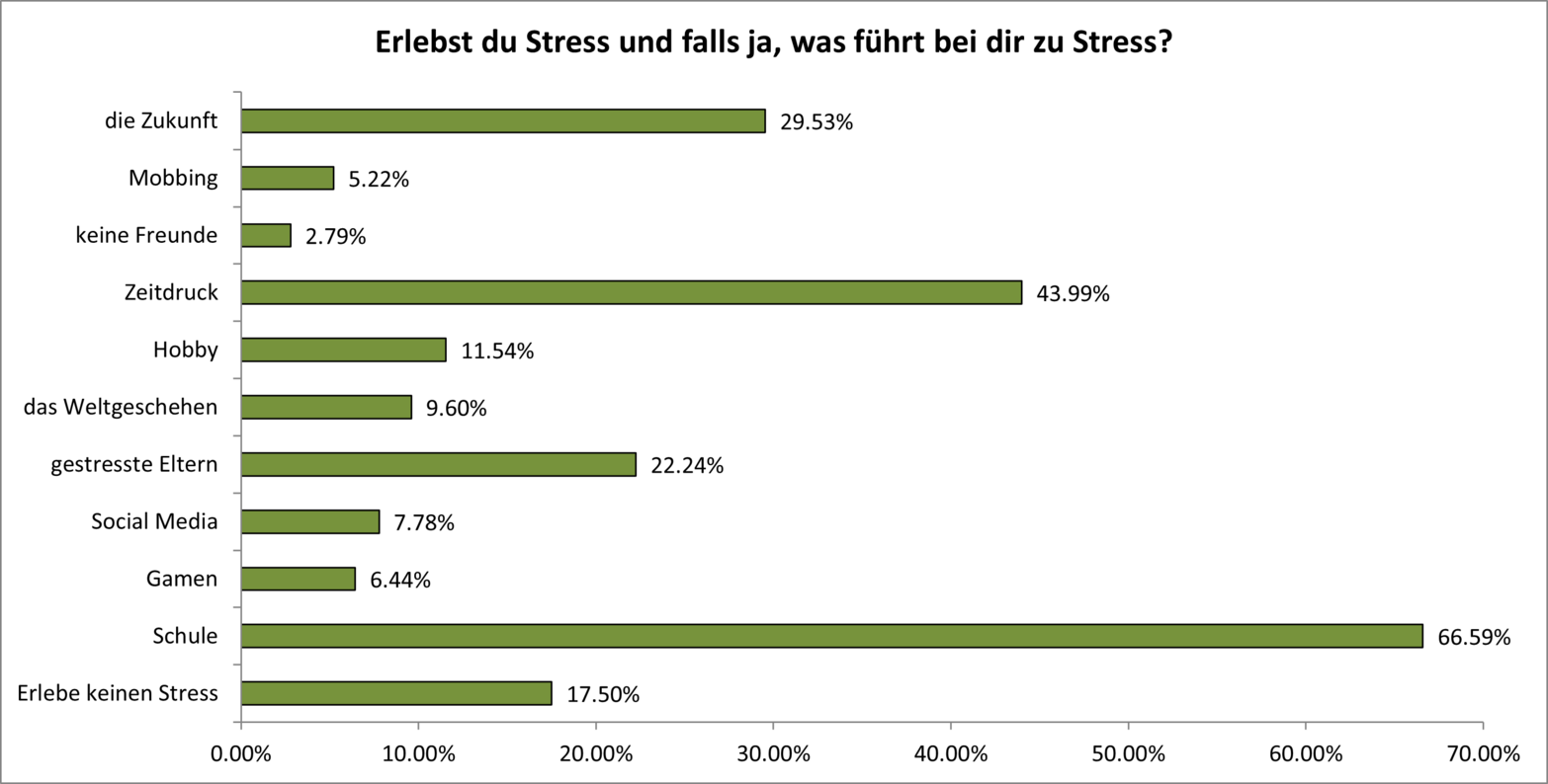 Das Blaue Kreuz Bern-Solothurn-Freiburg führte von Januar bis Ende Juni 2024 mit 823 Schülerinnen und Schüler in unterschiedlichen Oberstufenschulen Präventions-Workshops in den Kantonen Bern und Freiburg durch. Nach dem Workshop konnten alle Teilnehmenden anonym einen Rückmeldebogen ausfüllen. Nebst Substanzkonsumfragen durften die Schülerinnen und Schüler erstmals festhalten, was in ihrem persönlichen Leben zu Stress führt. Dazu konnten die Befragten verschiedene Aussagen ankreuzen sowie selbst ergänzen, welche Stressfaktoren sie erkennen und erleben. Die Ergebnisse zeigen, dass die Jugendlichen primär Stress in der Schule erleben (66.6 %) und dies entsprechend Auswirkungen auf das Wohlbefinden hat. An zweiter Stelle folgt zu hoher Zeitdruck (44 %). Zu Stress führt jedoch auch die ungewisse Zukunft (30 %), gestresste Eltern (22.2 %) sowie die eigenen Hobbys (11.5%). Lediglich 17.5 % der Befragten erleben keinen Stress.