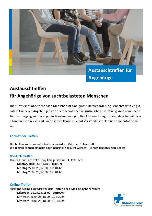 Die Sucht eines nahestehenden Menschen ist eine grosse Herausforderung. Finden Sie Unterstützung in unserer Austauschgruppe.