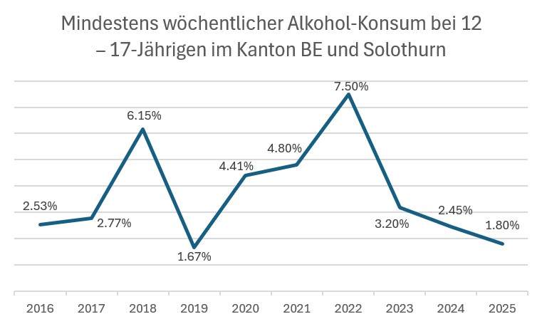 Im Rahmen der Suchtpräventions-Workshops des Blauen Kreuzes BE-SO-FR werden die teilnehmenden Jugendlichen im Alter von 12 bis 17 Jahren anonym zu ihrem Konsumverhalten und ihren Beweggründen befragt. Seit 2016 nehmen jedes Jahr rund 1'000 Schülerinnen und Schüler daran teil. Die Auswertung des Jahres 2025 beruht auf den Angaben von 975 Jugendlichen.