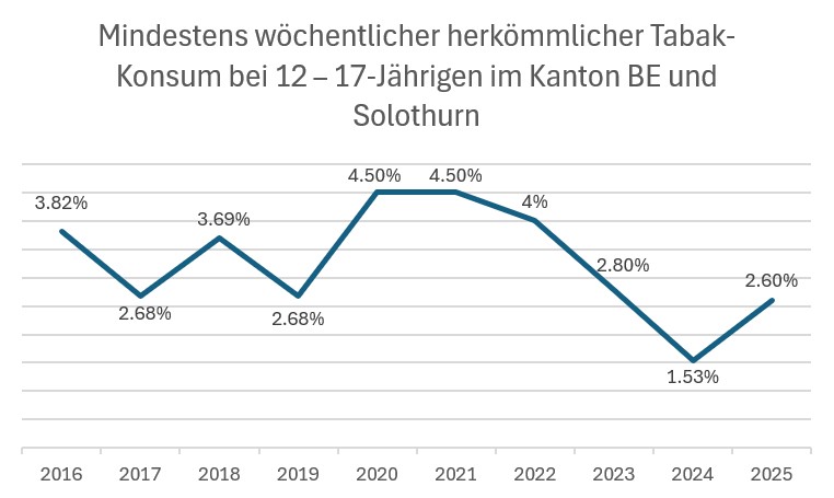 Der herkömmliche Tabakkonsum hat in den letzten Jahren bei den Minderjährigen im Kanton Bern leicht abgenommen. Anders sieht das Bild bei den alternativen Nikotinprodukten aus. Vapes sind gesellschaftlich im Trend. Die neuen Produkte sind billig, leicht verfügbar, und zielen mit süssen Aromen und farbenfrohem Design besonders auf Jugendliche ab. Die Vermarktung erweckt den Eindruck, dass Vapes harmlose Produkte sind. Das darin enthaltene Nikotin kann jedoch rasch zu einer Abhängigkeit führen und bei Kindern und Jugendlichen die Hirnentwicklung negativ beeinflussen. Ob und wie weit die neuen Nikotinprodukte und deren gezielte Vermarktung auch den herkömmlichen Tabakkonsum von Jugendlichen beeinflussen, werden die nächsten Jahre zeigen. Im Moment gibt es lediglich Anzeichen dafür, dass Jugendliche verschiedene Nikotin- und Tabakprodukte gleichzeitig konsumieren.
