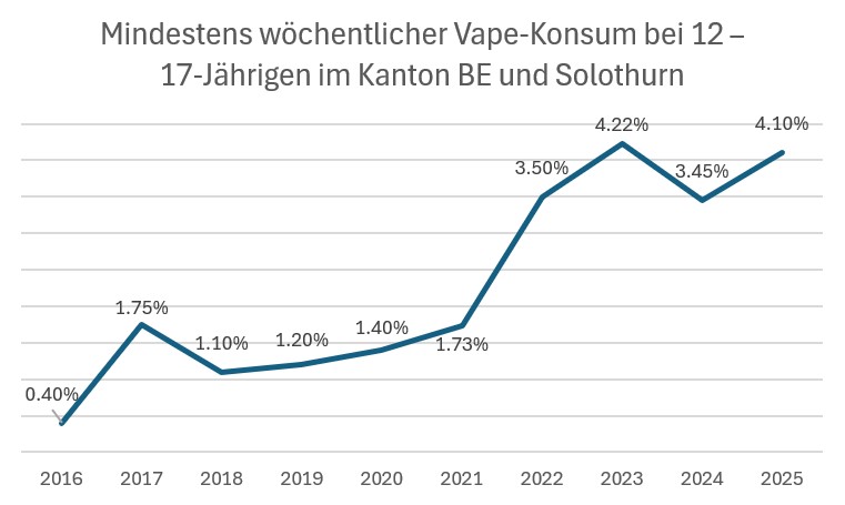 Seit 10 Jahren erfasst das Blaue Kreuz Bern-Solothurn-Freiburg den Substanzkonsum von Jugendlichen im Rahmen von schulischen Workshops im Kanton Bern. Die Auswertung des Jahres 2025 bestätigt den Trend, welche das Suchtpanorama von SuchtSchweiz am 5. Februar veröffentlichte.
