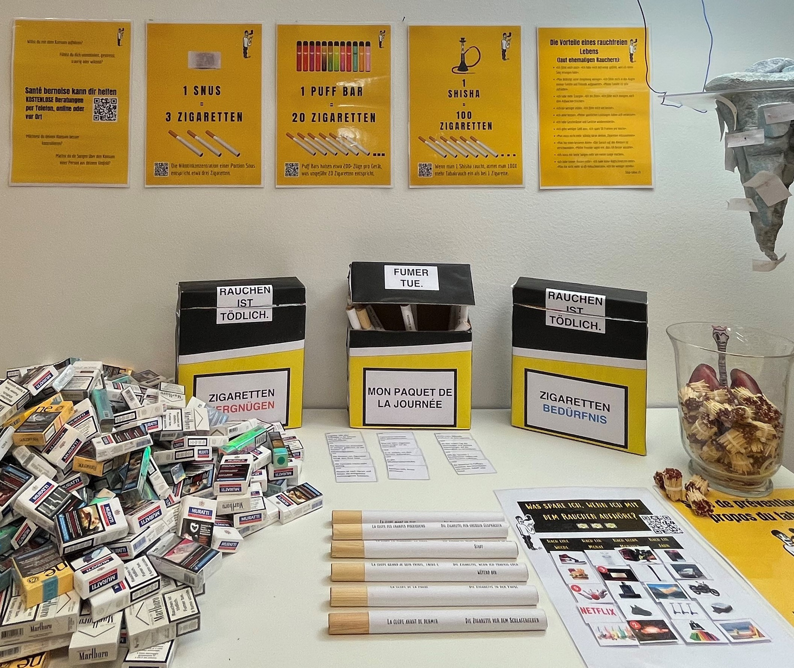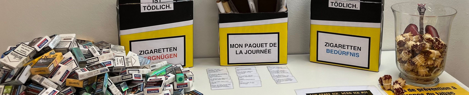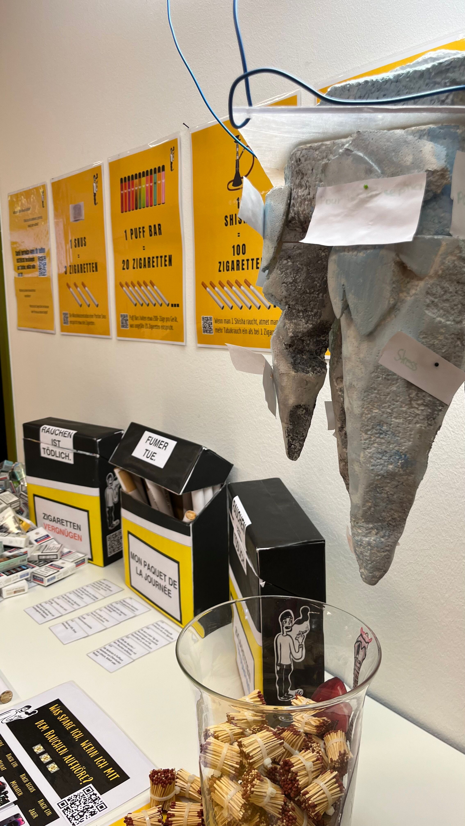 Die interaktive Ausstellung zu Tabak- und Nikotinprodukten wurde uns zur Verfügung gestellt durch die Villa Ritter, Jugendtreff in Biel. Die Ausstellung beinhaltet Informationsmaterial, Spiele und interaktive Übungen, damit Jugendliche ihren Konsum reflektieren können. Ziel ist die aktive Auseinanersetzung mit dem eigenen Konsum und dem eigenen Suchtverhalten. Die Spiele und interaktiven Übungen sind so konzipiert, dass Reflexion stattfindet.