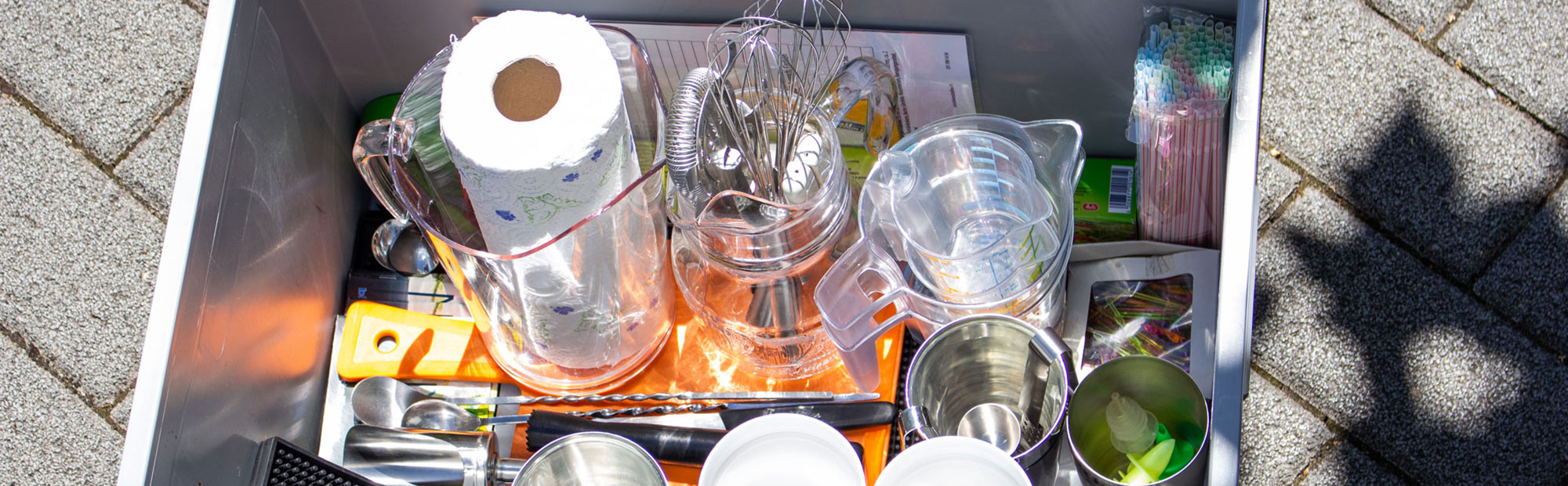 Wir vermieten zwei Barboxen. Diese beinhalten Materialien für je zwei Barstationen, die Sie bei Ihrem Event zum Shaken und Mixen von Drinks benötigen. In der Barbox (als DVD) oder online unter www.youtube.com/watch?v=yT61MusJRts finden Sie eine Anleitung zur professionellen Anwendung der Barutensilien.