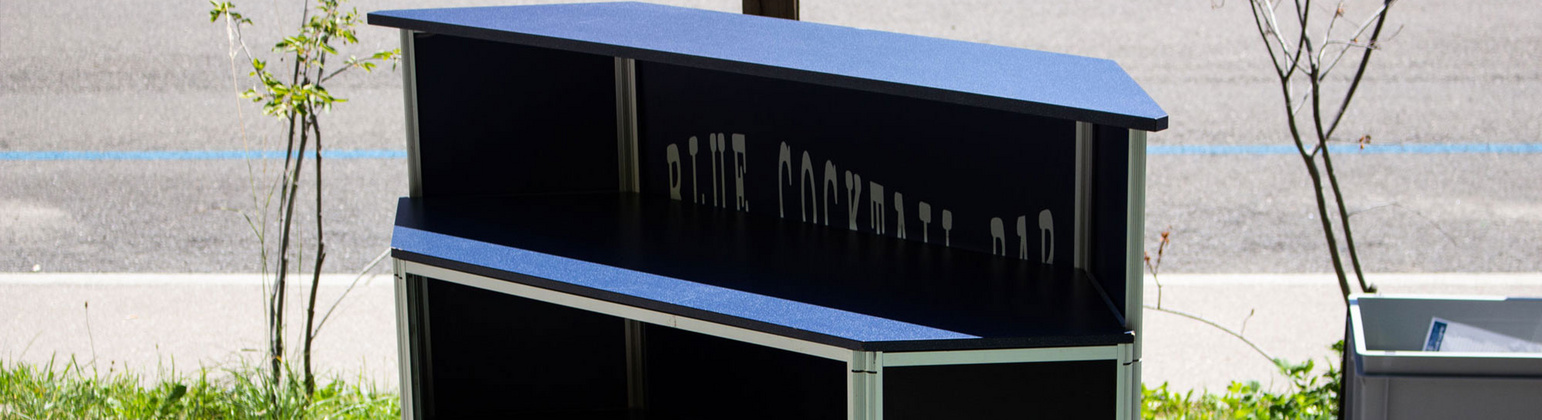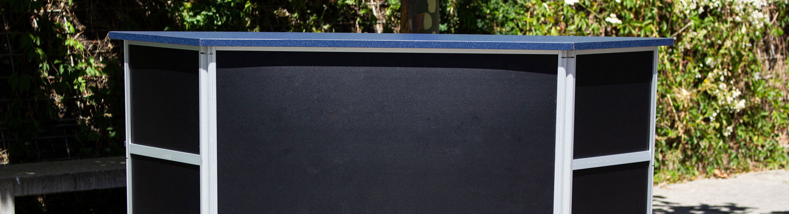 Wir vermieten eine mobile Bartheke. Diese können Sie an Ihrem Event in wenigen Handgriffen selber aufbauen. Die Bar bietet genügend Platz für zwei Barstationen. Die Theke ist in zwei Stofftaschen verstaut und kann ganz einfach in einem PW transportiert werden. Die mobile Bartheke muss bei uns abgeholt werden.